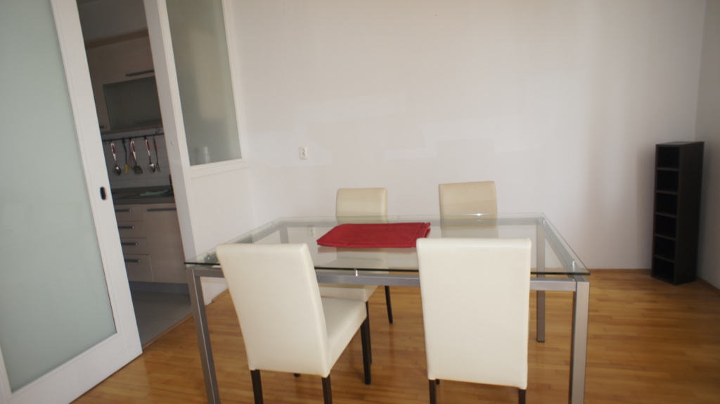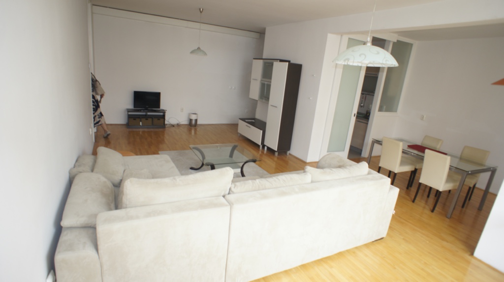 Ulaskom u stan je hodnik iz kojeg je lijevo kuhinja koja se nastavlja u trpezariju i veliku dnevnu sobu.